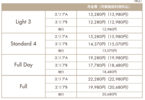 エリアAは月額料金で300円~1600円の値上げになるので、施設利用料700円との合計で月当たり1000円~2300円の値上げとなります。